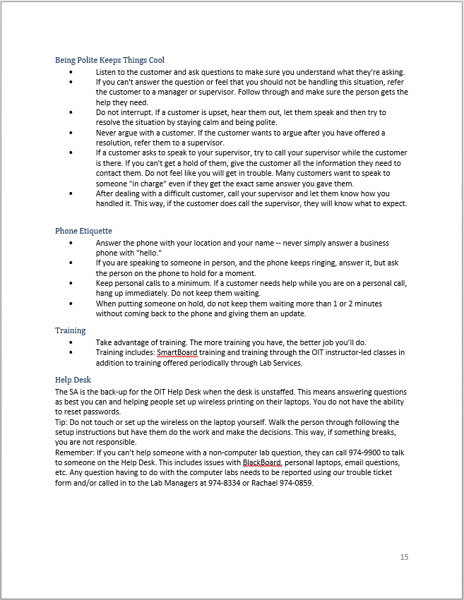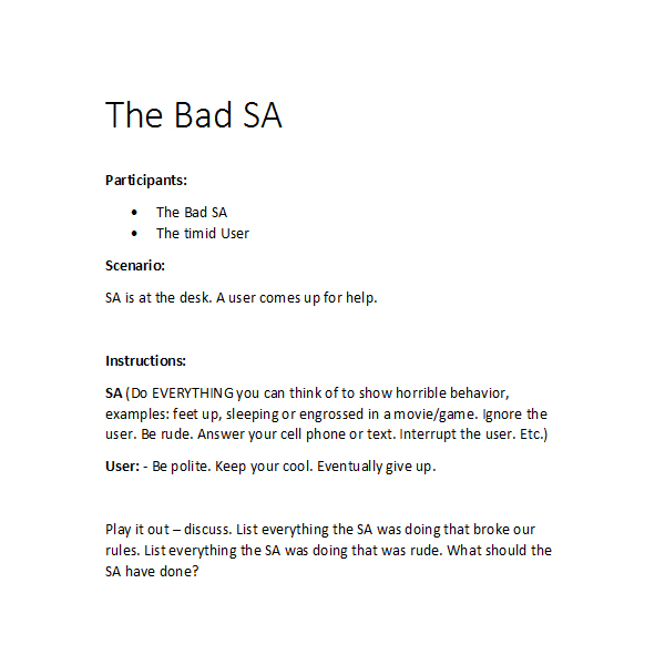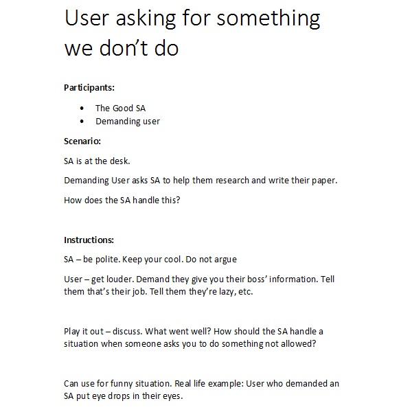 Periodically, we did mass training sessions for our students that involved discussion and role play. Below are some examples of the role-play scenarios I have used for training Student Assistants.