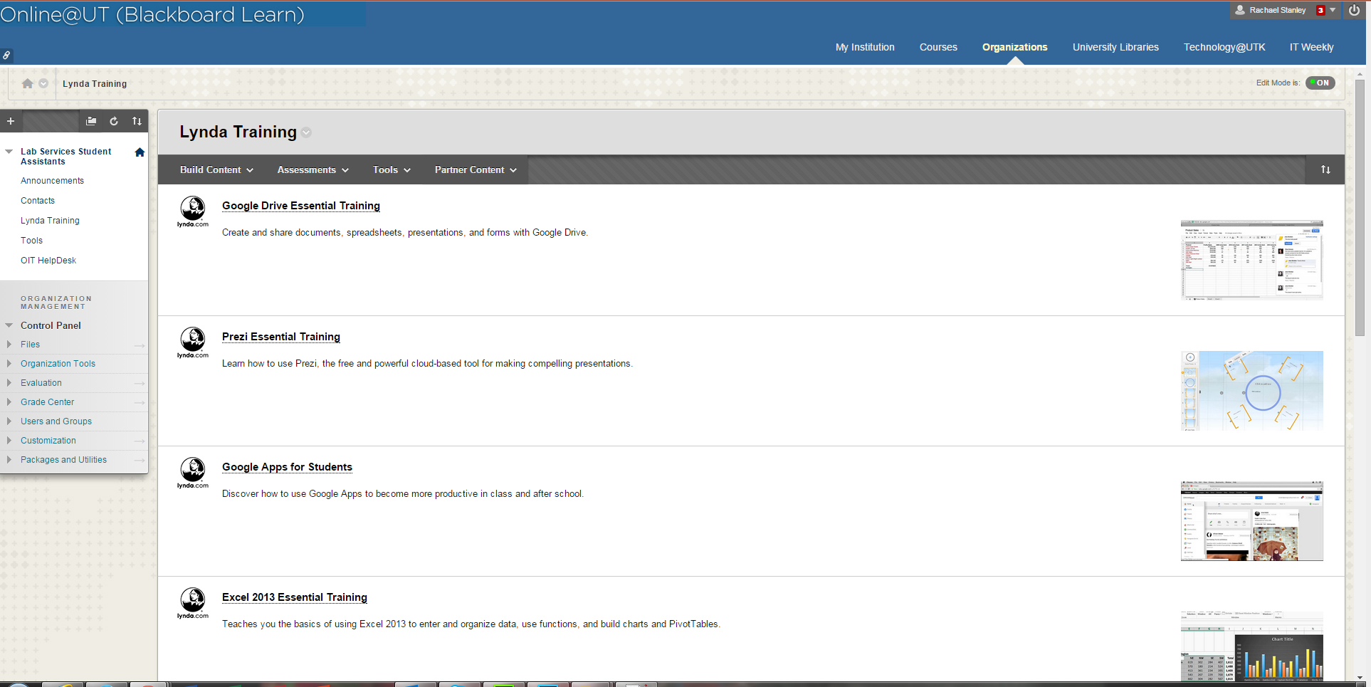 When working for Lab Services, to prepare our Student Assistants for more responsibilities and to help them be more helpful for our patrons, I began a program to encourage students to take Lynda.com (later LinkedIn Learning) training. I had a group using Blackboard that the students belong to and could access a Lynda.com playlist of required and recommended training material.